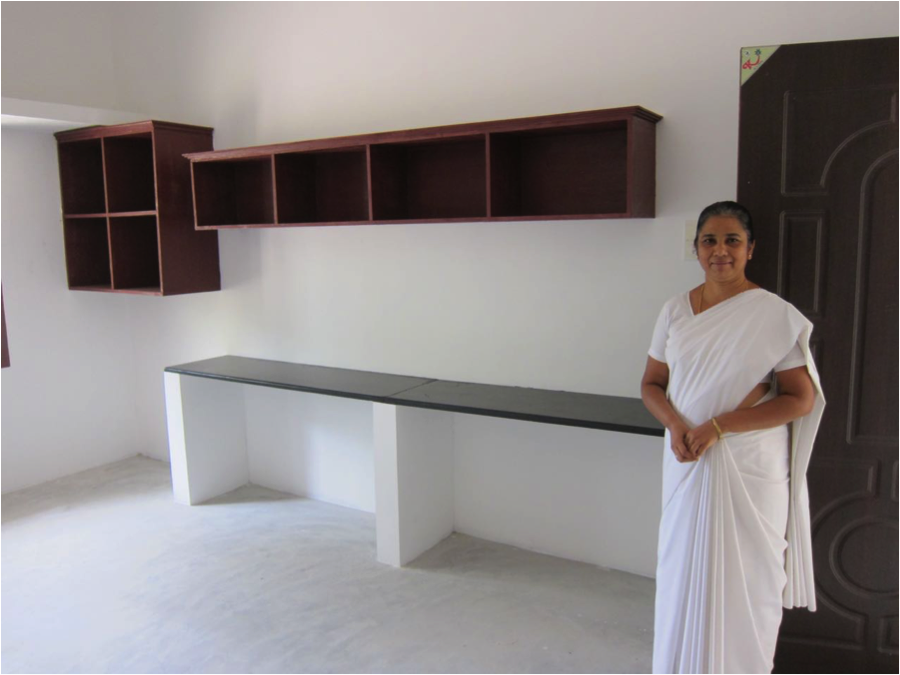 Mrs. Asha Noble, saintly woman, Principal, School of Nursing, inside a no frills quad hostel room, with desks, book cases and storage facilities for 4 nursing students.
