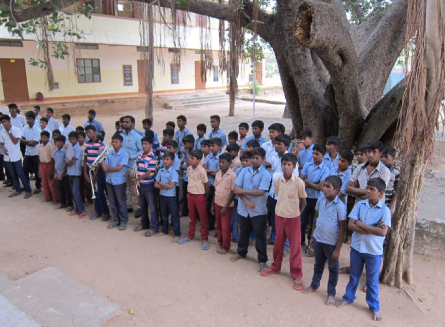Boarding students assembled in front of the banyan tree planted in the courtyard of Arni Higher Secondary School. The banyan tree is a symbol of the Church of South India because it always plants new roots and never dies. Notice the students with trumpets. We had a parade with a brass band upon my entry into the school.