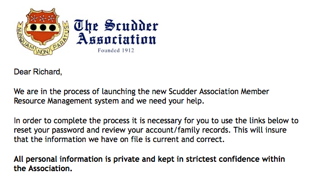 E-mails will being going out requesting members to register on-line and initiate their membership on the new system. The MRM will automate administrative functions along with integrating the website with social media applications such as, FaceBook, Twitter and LinkedIn. This is in an effort to connect Scudder’s from all over the world with one another.