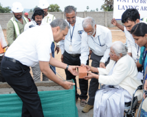 Dr. Sunil Chandy, Director, CMC Vellore, hands the first brick to centenarian alumna, Ms. Anna Jacob.