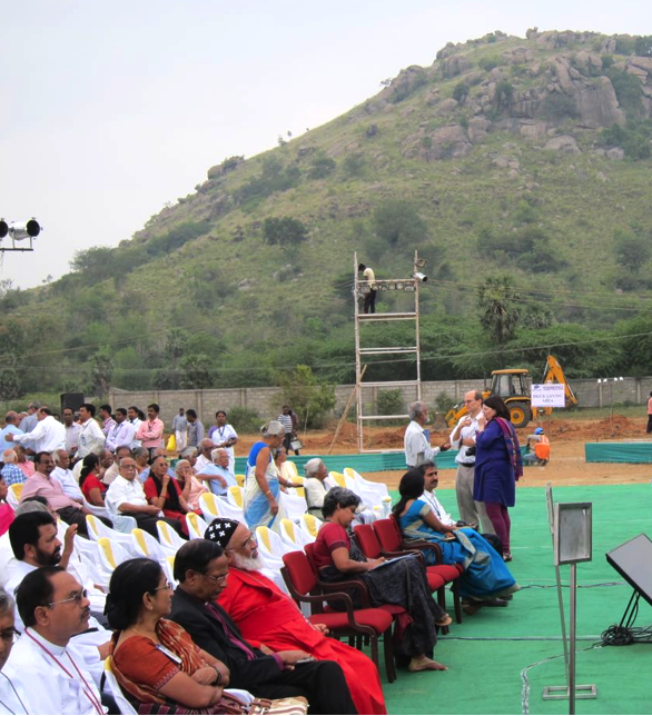 The gathered luminaries include Bishop Rajavelu of the Vellore Diocese, closest to camera. The gentleman in the red robe is a Bishop of the Syrian Orthodox Church in India, an example of the ecumenical governance of CMC. The mountain in the background gives a feel for the spacious quality of the site.