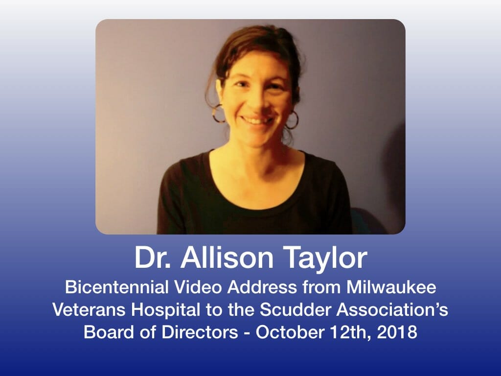 Dr. Allison Taylor, great,great,great,great granddaughter of Dr. Silas Scudder, founder of Scudder Memorial Hospital, Ranipet, India, presented to the Board of Directors’ Bicentennial meeting, October 12th, 2018,  via video. Allison was unable to attend the Annual Meeting but shared her experience after an 8 day rotation in a Veteran’s Hospital, where she is completing her residency.